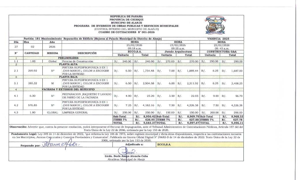 Notificación de Cuadro de Adjudicación N°. 01-2026